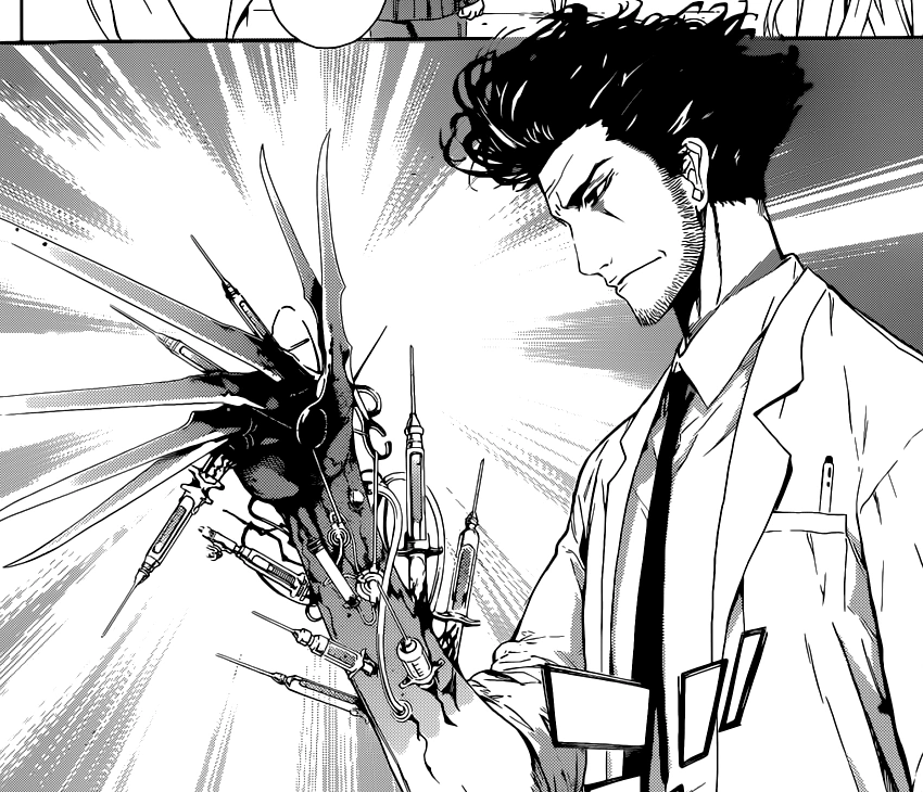 - Начало Операции - Способность Соги, позволяющая ему превращать свою правую руку в груду врачебных инструментов, в основном скальпели и шприцы, вырастающие из запястья и пальцев. После этого он может проникать в тела пациентов, не нарушая целостность кожи, излечивая их изнутри, восстанавливая сосуды и вливая физраствор с лекарственными средствами. Его способностей достаточно, чтобы за несколько минут восстановить несколько поврежденных органов и сломанных костей, и даже собрать разрубленного пополам человека. Способность отнимает довольно много сил. (рис.1)