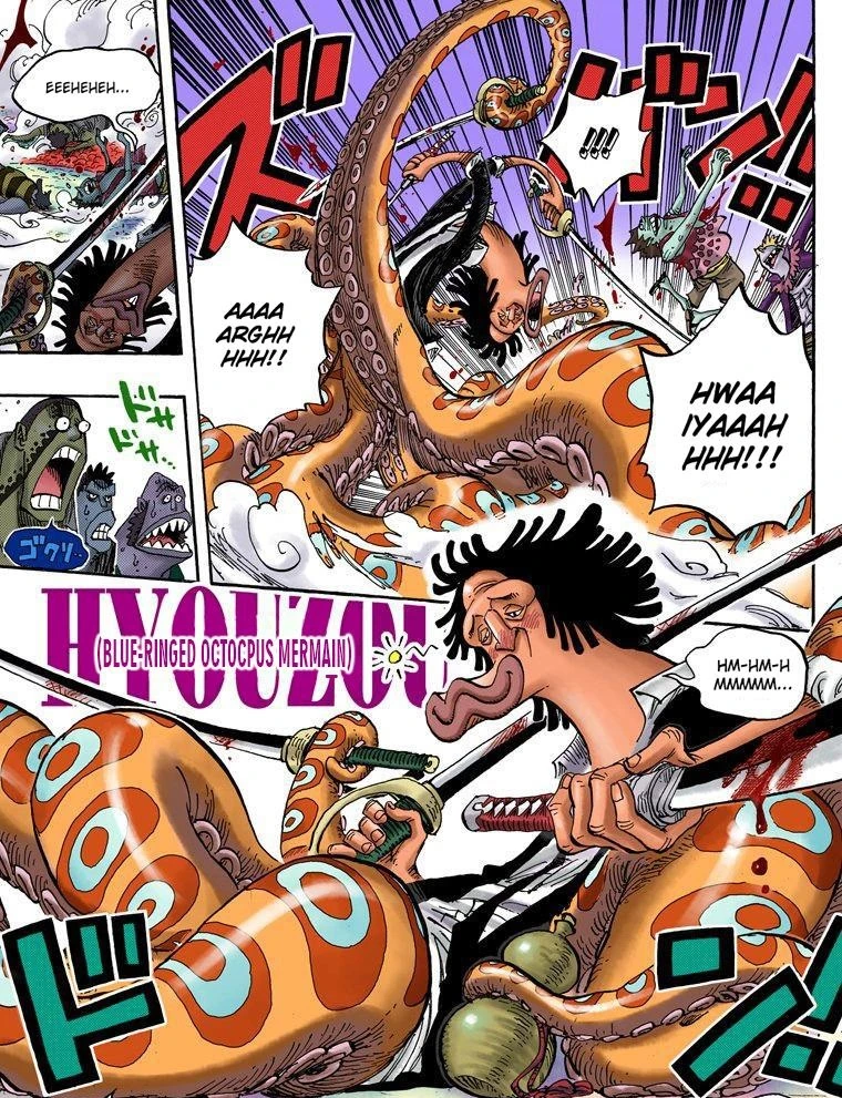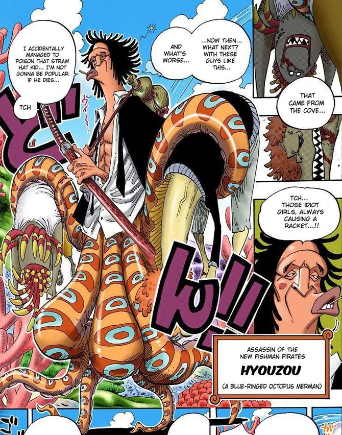 - Яд - Будучи синекольчатым осьминогом, Хьёзо способен выделять смертельный для человека яд из своих щупалец. В основном он смазывает этим ядом мечи. В настоящее время противоядия от яда синекольчатого осьминога не существует. Яд синекольчатого осьминога оказывает нервно-паралитическое действие. Он содержит тетродотоксин, серотонин, гиалуронидазу, тирамин, гистамин, триптамин, октопамин, таурин, ацетилхолин и дофамин. Тетродотоксин блокирует натриевые каналы, вызывая паралич двигательных отделов нервной системы, остановку дыхания и как следствие - остановку сердца из-за нехватки кислорода.